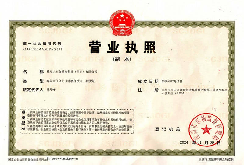 神舟太空食物高科技(深圳)无限公司做为施行中国航天员科研锻炼核心专利手艺的企业,严酷遵照国度军用尺度《航天食物卫生要求》。这一尺度可谓我国食物范畴的最高尺度,航天员食物不答应添加防腐剂,检测目标多达36 - 41项。如斯严苛的尺度,确保了公司出产的航天员太空食物的高质量和平安性。公司承担着我平易近融合项目平易近用化、财产化的推广,将本来办事于航天员的高科技食物推向公共市场,为人们的日常糊口带来平安健康的食物选择,创制了人类公共群体日常糊口平安健康食物的无限可能。