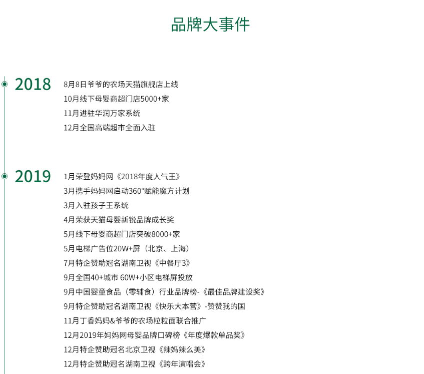 爷爷的农场各类营销勾当背后,次要是为了正在合作激烈、信赖门槛极高的婴长儿食物市场中,快速成立身牌信赖、实现差同化合作,并高效触达方针消费者。官网引见,爷爷的农场品牌所属公司为艾斯普瑞企业无限公司(),从营品类包含婴长儿辅食、零食、食用油及调味品等。爷爷的农场以“实材料、少添加、有养分”为产物开辟,配方自研,严控产物工艺和质量,精选全球各地独具劣势的优良原材料,努力于为家庭和孩子们供给天然、健康、养分的优良食物。爷爷的农场号称原产欧洲的天然婴长儿食物品牌,凭仗“进口”的卖点,敏捷打开销。官网显示,仅用2个月时间,爷爷的农场进入中国5000+家线个月时间,进驻华润万家系统;4个月,入驻全国高端超市。不到一年,爷爷的农场就入驻孩子王系统、进入了8000+家线下母婴商超门店,正式正在食物母婴行业坐稳脚跟。