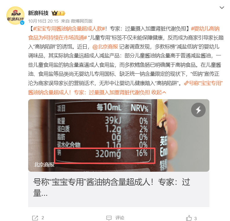 值得一提的是,按照国度相关,针对婴长儿辅帮食物的“婴标”国标共有三项,别离笼盖分歧品类和月龄:合用于6—36月龄的GB10769《食物平安国度尺度 婴长儿谷类辅帮食物》,涵盖米粉、面条、米饼、泡芙等产物;同月龄合用的GB10770《食物平安国度尺度 婴长儿罐拆辅帮食物》,涉及果蔬泥、肉泥等;合用于6—60月龄的GB22570《食物平安国度尺度 辅食养分弥补品》,包含猪肝粉、辅食养分素撒剂等。合适“婴标”的产物需正在养分素强化、配料表、出产和出产天分等方面满脚严酷要求,部门尺度还会对钠含量进行限制。但“儿童酱油”“儿童食用盐”“鳕鱼肠”等品类均不正在这三类“婴标”的笼盖范畴内。10月21日,爷爷的农场就此事发布申明,暗示公司无机酱油钠含量合适国度相关尺度,相关锐意拿“特例”酱油和儿童酱油做比力,。